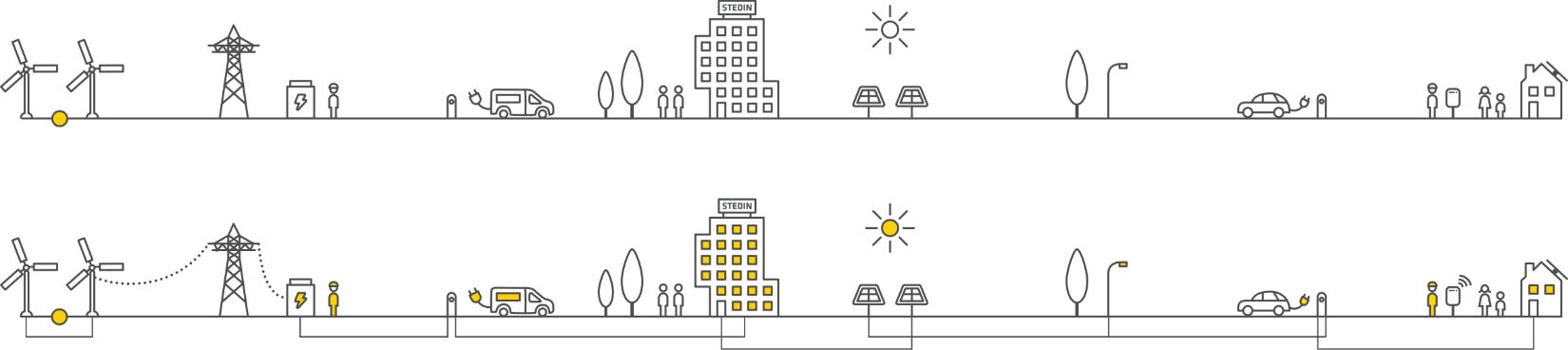 After the content mapping I created a visual representation of Stedin’s onboarding journey. As a new hire progressed through the timeline, they would see wind turbines, solar panels, utilities, the Stedin office and eventually their home being connected to the grid.