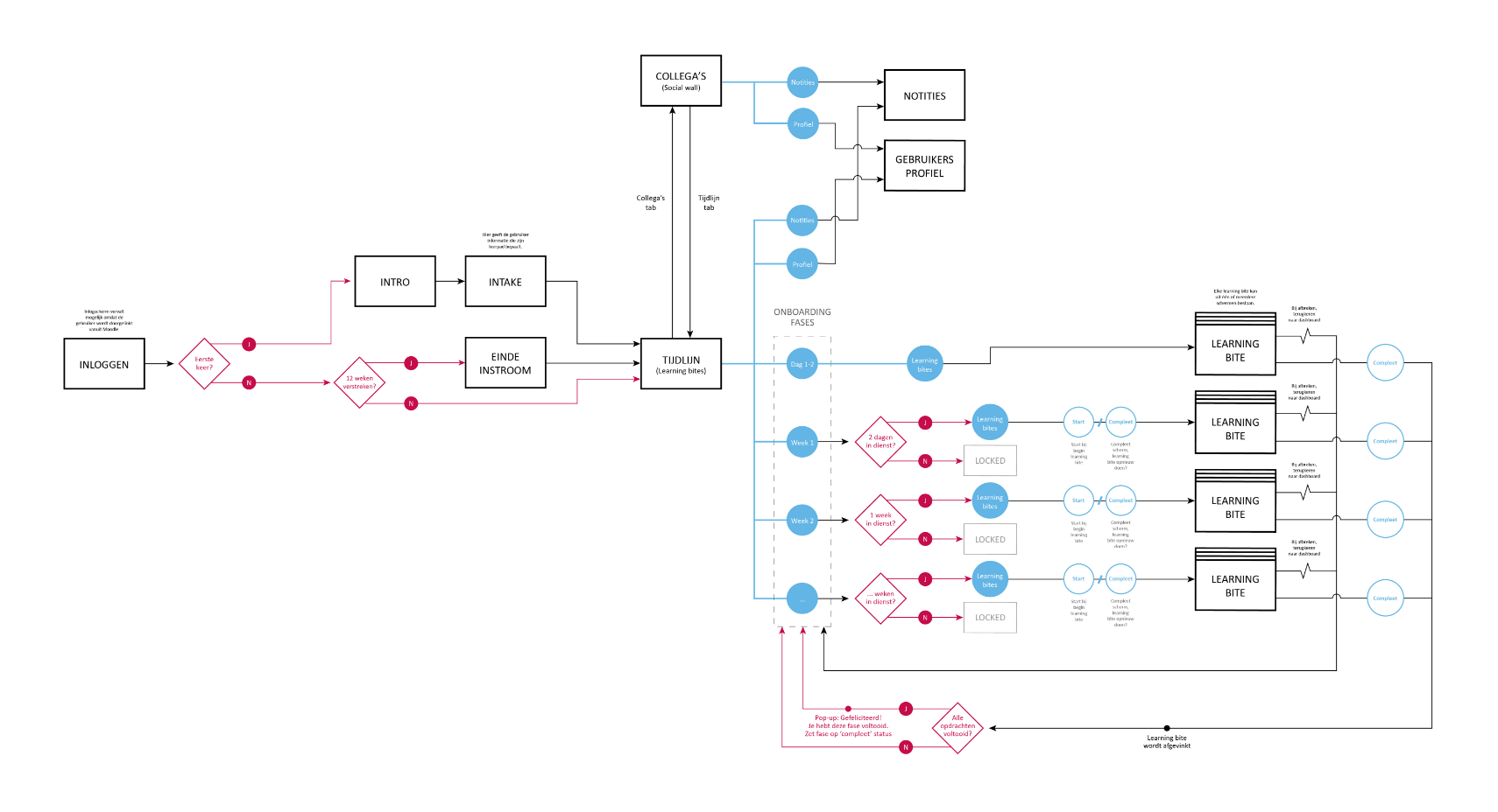 We first created and inventory of all the onboarding activities that Stedin already had (or wished to have) during this 100-day period. These were categorised across different topics, including online and offline activities and then plotted onto a timeline. Towards the end of the onboarding the density of activities was reduced as new hires would get used to their new role and would experience an increase in their day to day tasks and responsibilities.