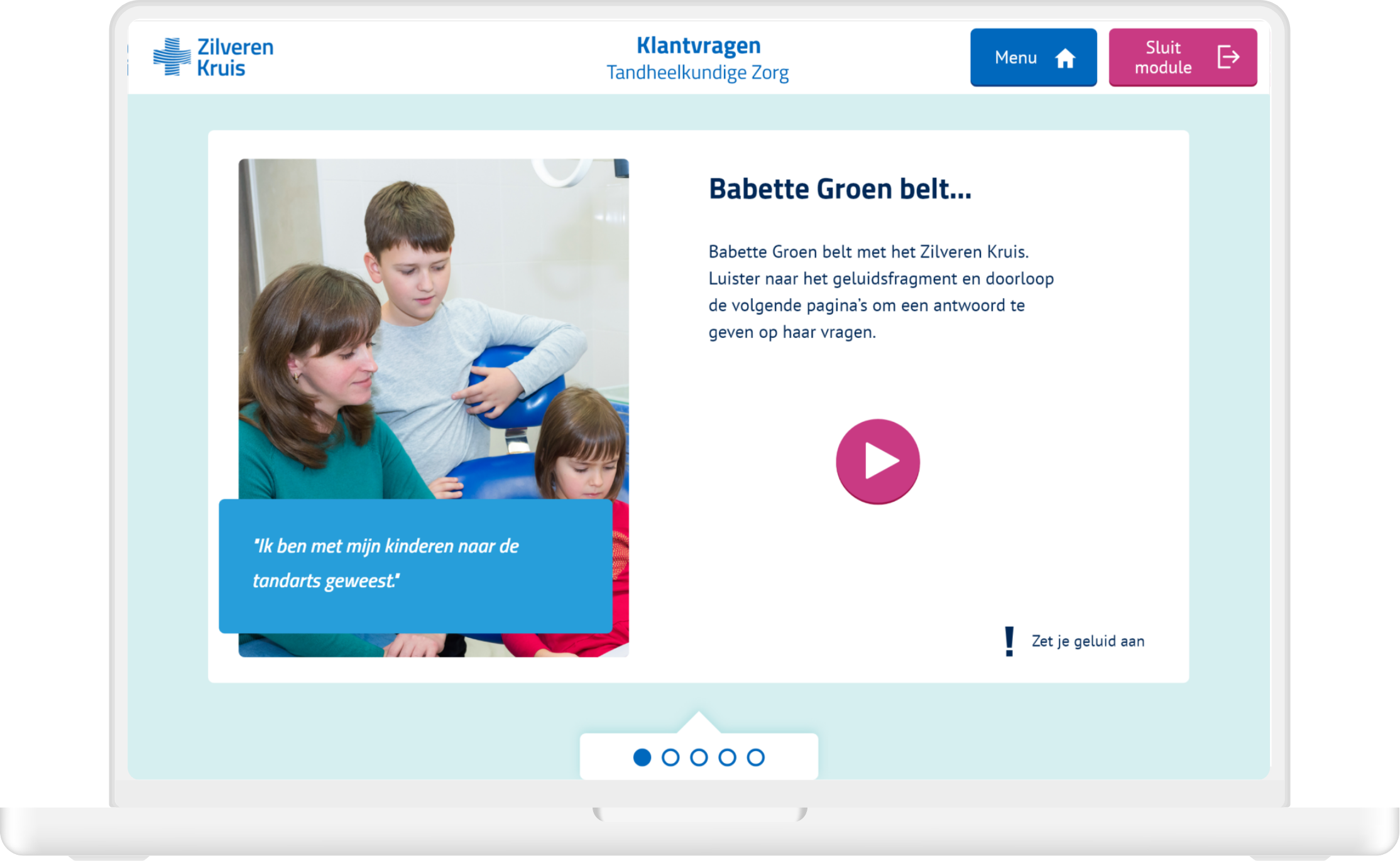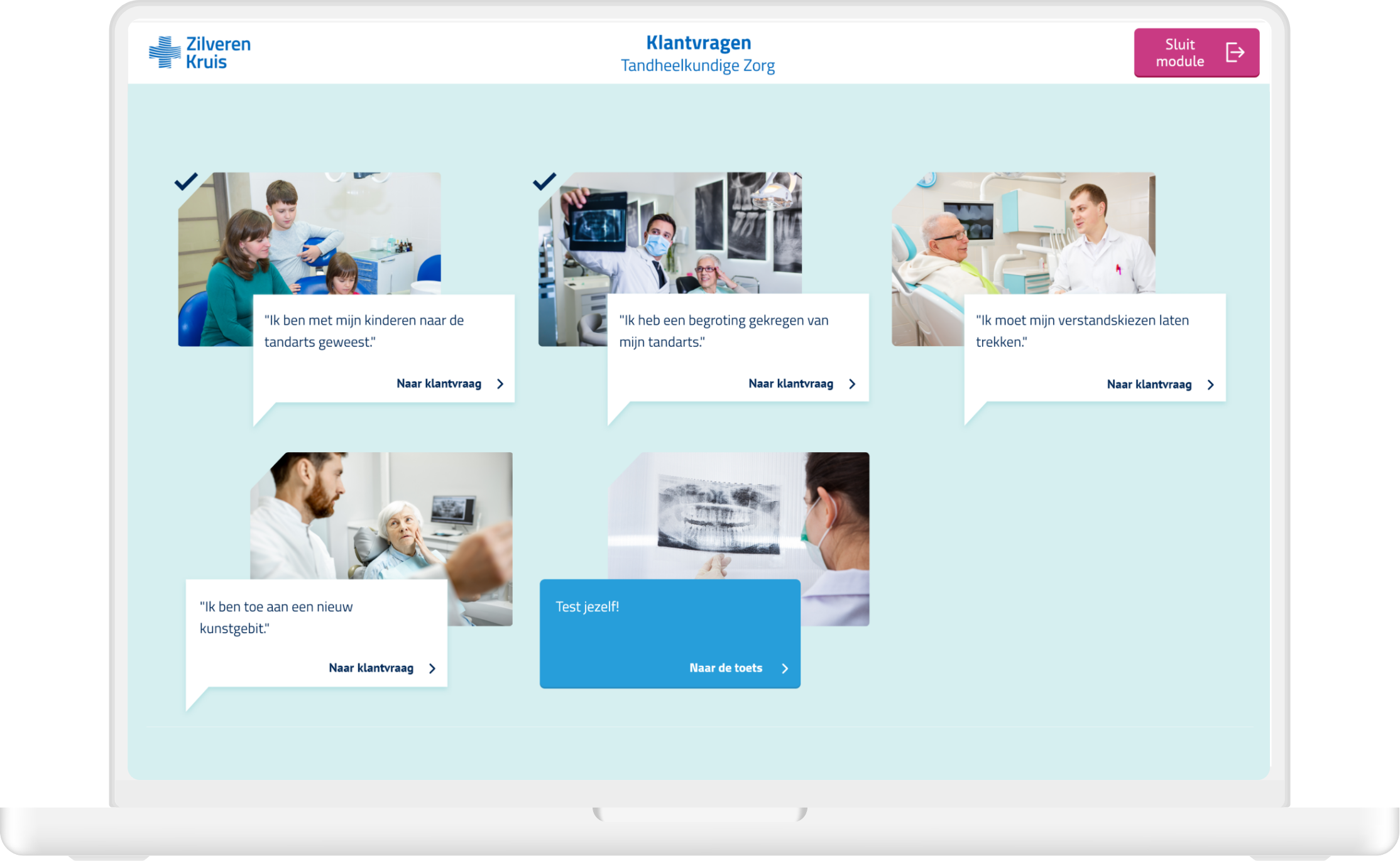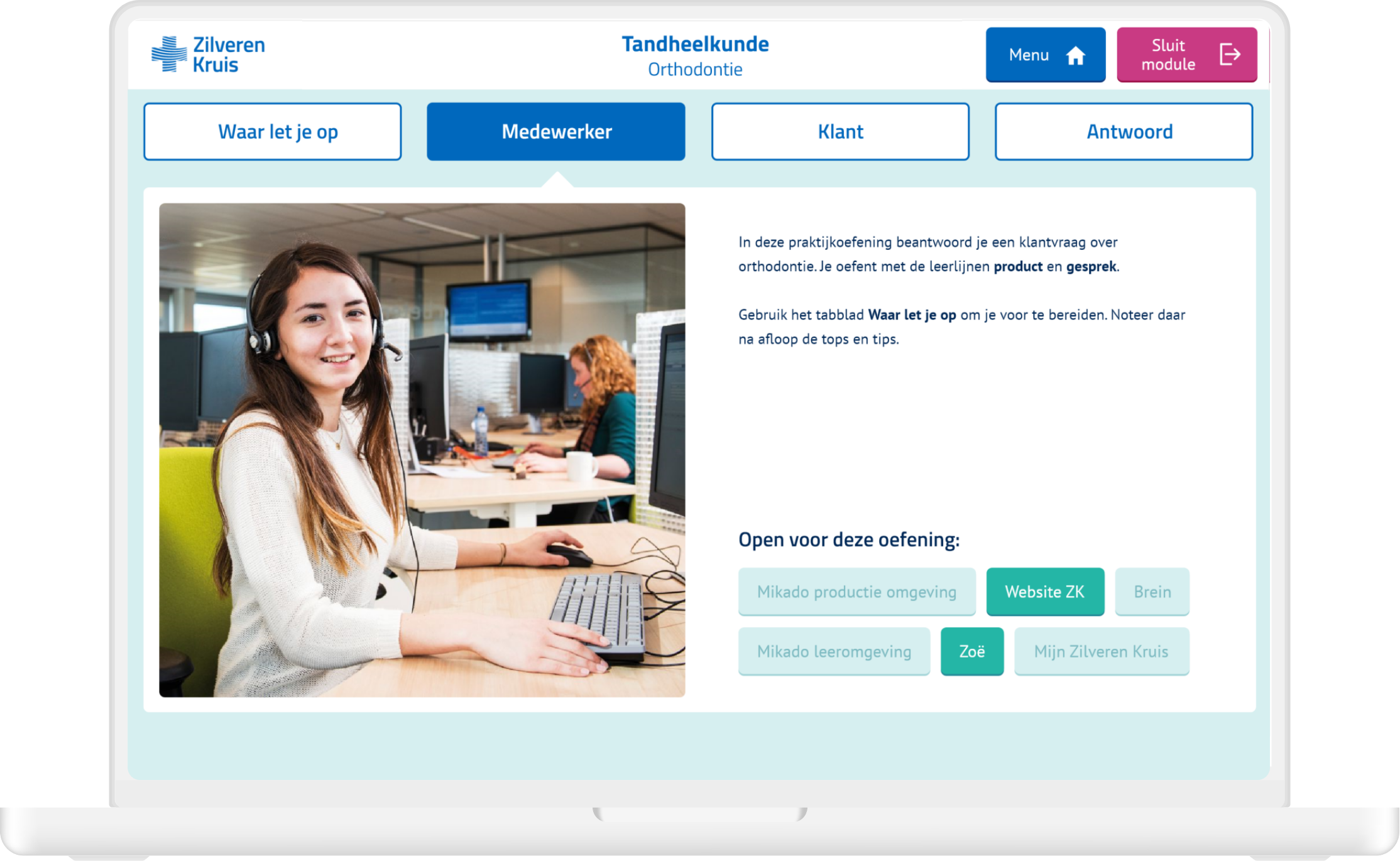 I was the single designer on this project and did all the design related work for the three sample modules. The three types of modules consisted of (1) practical exercises about customer inquiries, (2) a quiz and (3) a role playing game. I did the visual design, user interface and prototyping and also built the three modules in authoring tool Lectora. Zilveren Kruis could then use these modules as templates and only replace the content.