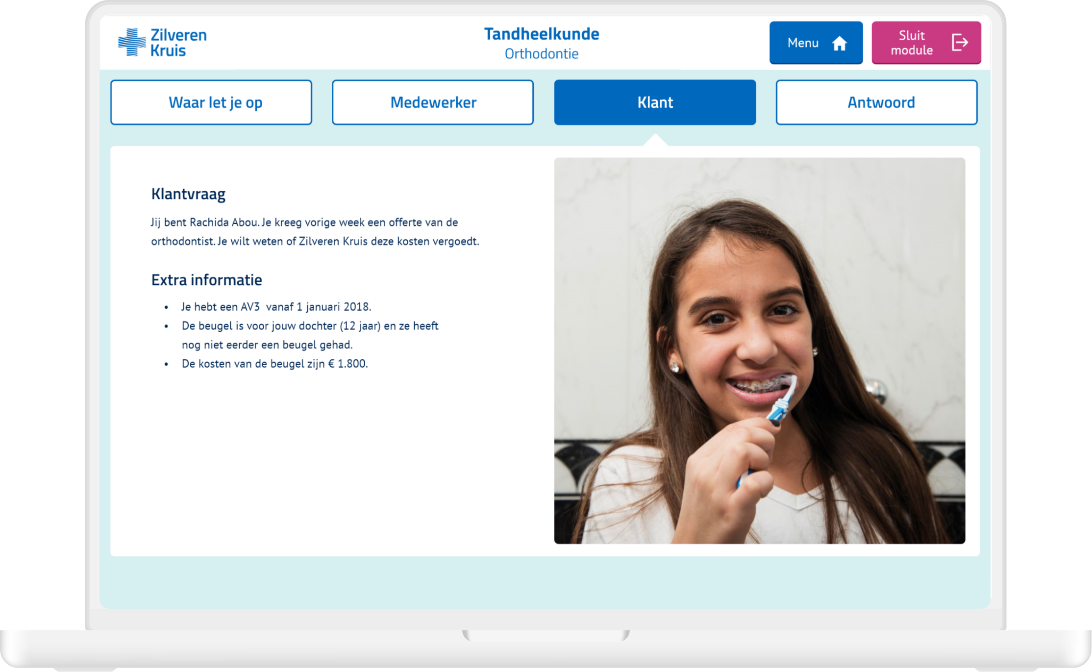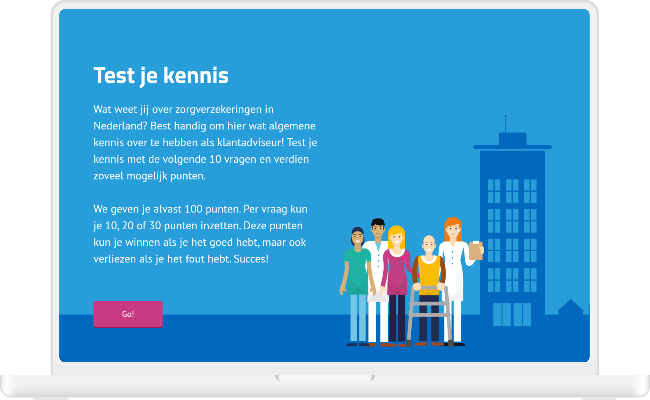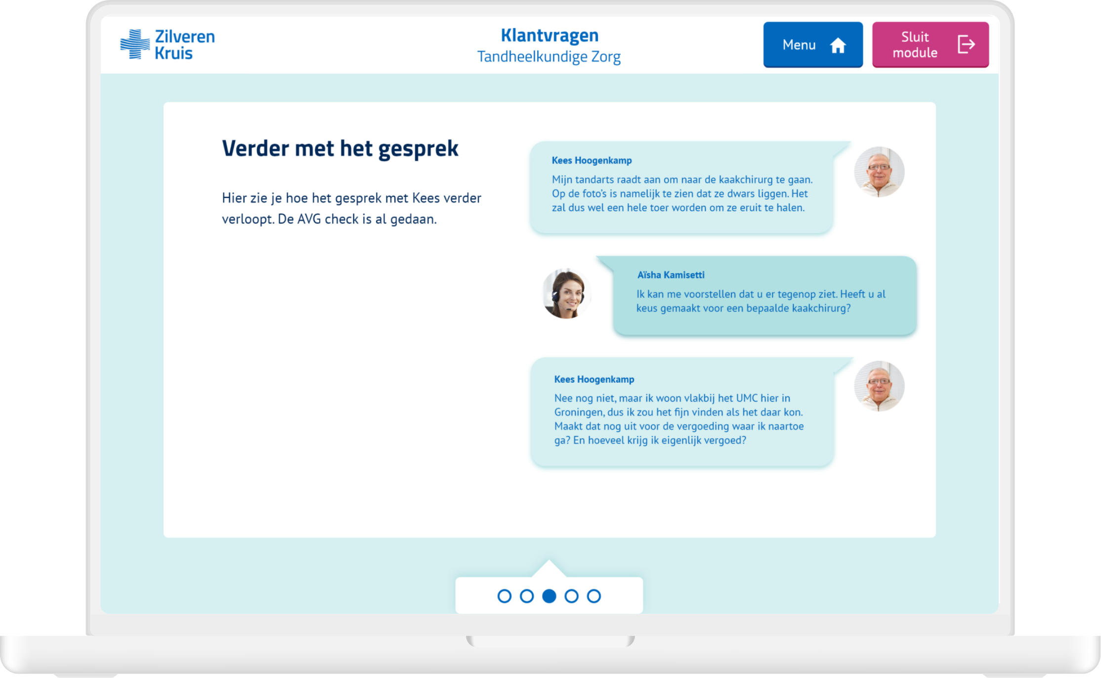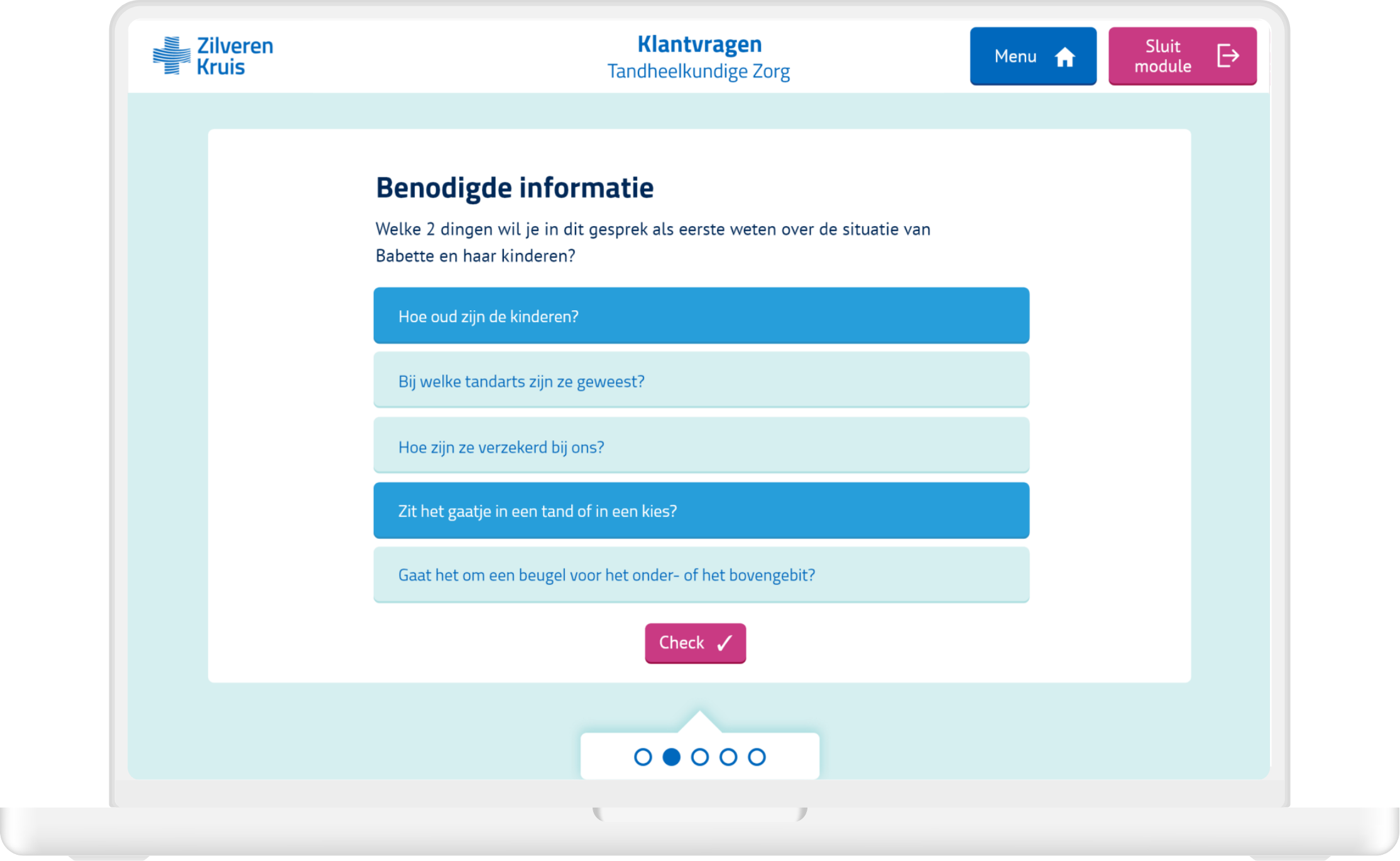 I was the single designer on this project and did all the design related work for the three sample modules. The three types of modules consisted of (1) practical exercises about customer inquiries, (2) a quiz and (3) a role playing game. I did the visual design, user interface and prototyping and also built the three modules in authoring tool Lectora. Zilveren Kruis could then use these modules as templates and only replace the content.