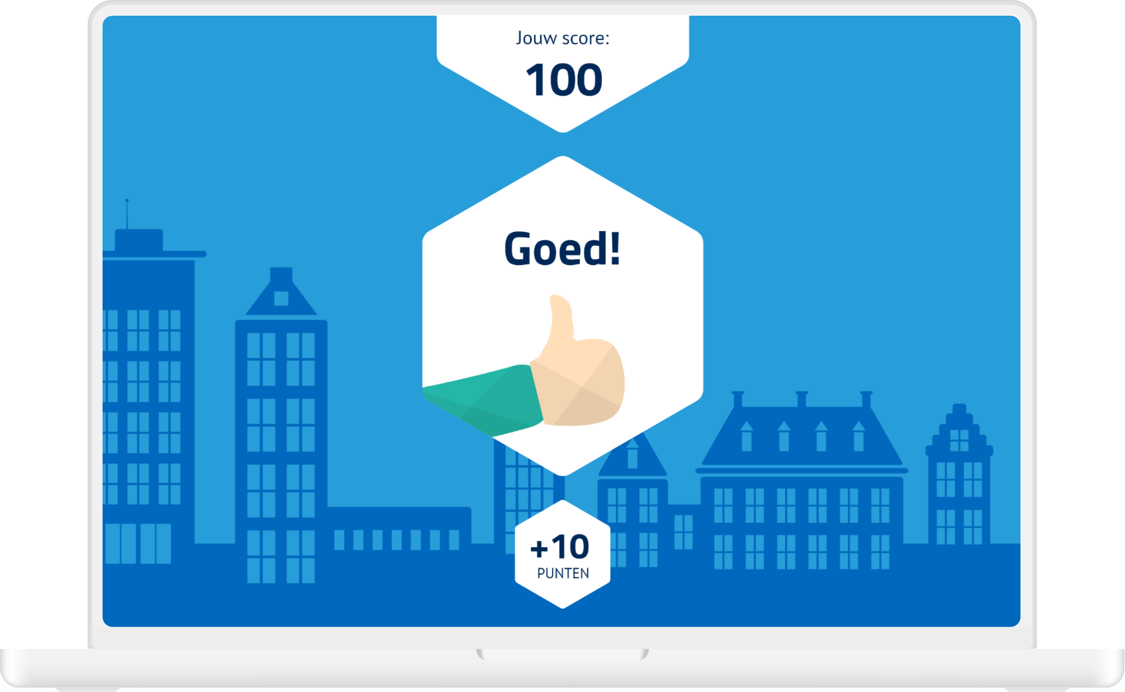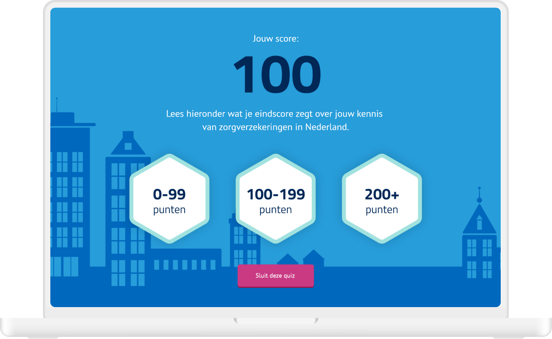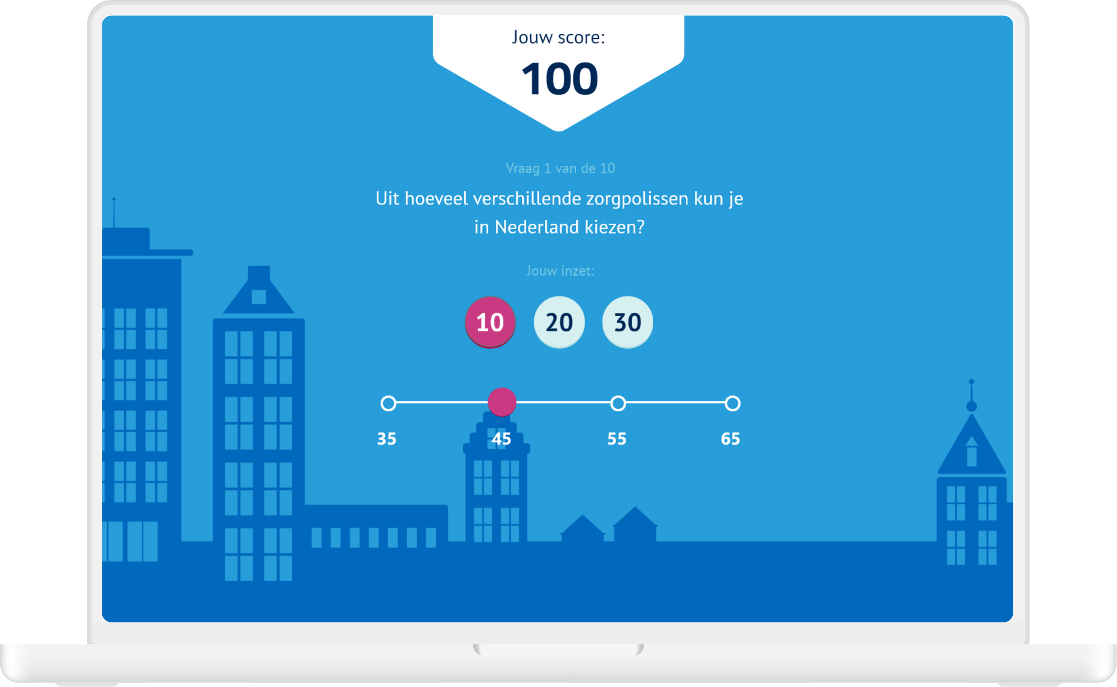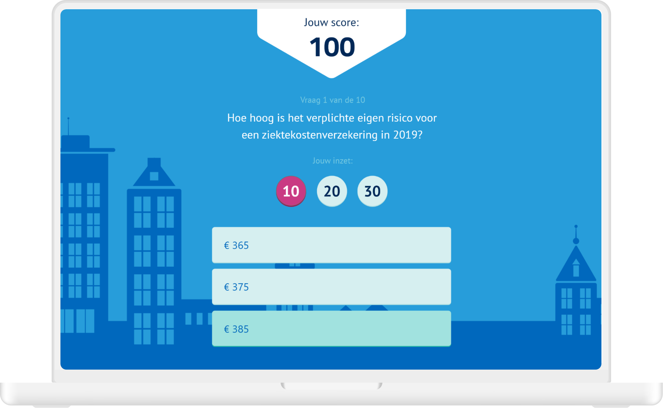 The advisors could test their knowledge by doing a quiz. They started the quiz with a 100 points and could ‘stake’ an amount of points on each question, which resulted in them doubling their stake if they had the question right, or losing it. At the end their score would say something about their knowledge level.